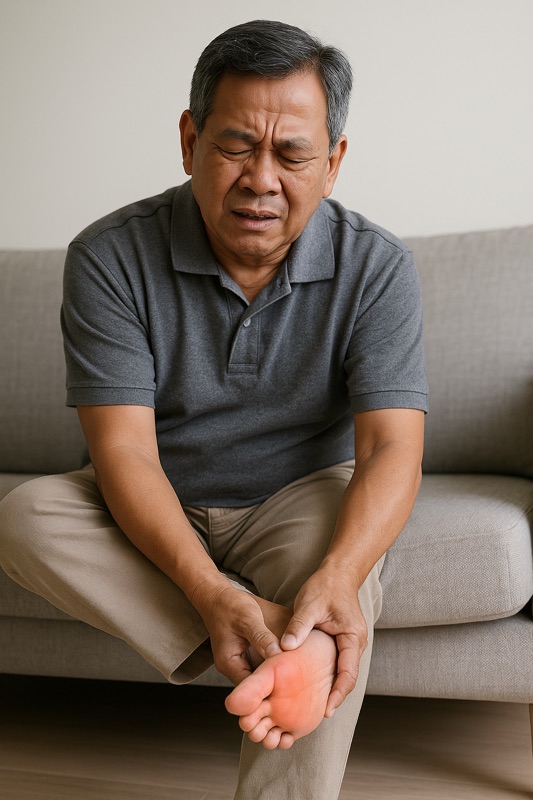 คุณภาณุ อายุ 62 ปี เป็นเบาหวานมา 15 ปี เริ่มปวดแสบร้อนที่ปลายเท้าทั้งสองข้าง โดยเฉพาะตอนกลางคืน ชาเหมือนใส่ถุงเท้าหนา ๆ เดินนาน ๆ เหมือนเท้าจะลอย ๆ ไม่มีแรง เขาจึงไปหาหมอและบอกว่า
