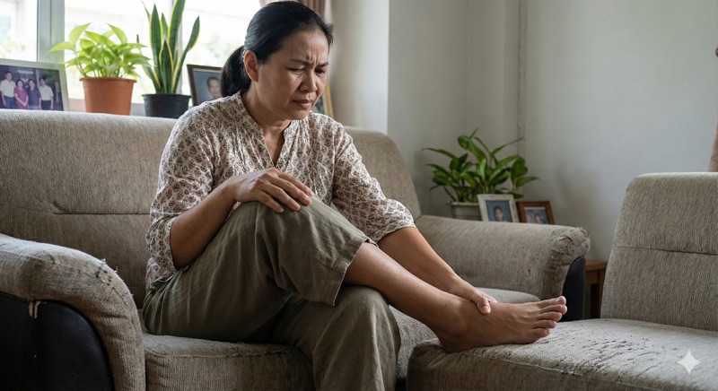 อาการตอนกลางคืน: บางท่านมีอาการปวดหรือชาจนต้องตื่นขึ้นมาสะบัดขา หรือนวดเท้ากลางดึก